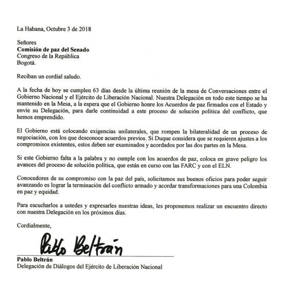 El jefe negociador del ELN Pablo Beltrán le envió esta carta a Roy Barreras como presidente de la Comisión de Paz del Senado para que interceda con el presidente Iván Duque y se asegure de enviar una comisión a La Habana. Ya son 66 los días desde que los diálogos no dan un solo paso, pero el presidente ni siquiera ha dado un nombre que pueda liderar un nuevo equipo de negociación. Roy Barreras, que no tiene los lazos rotos con el Gobierno, podría destrabar la mesa convenciendo a Duque, que mantiene las exigencias que le hizo a la guerrilla desde que asumió el poder. Precisamente, esos son los reclamos de Beltrán que puntualiza en texto: