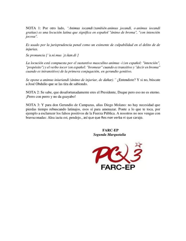 El vídeo levantó reacciones negativas de todos lo sectores, empezando por el Presidente quien le respondió: “Los combatimos sin tregua en defensa del pueblo colombiano”. Santrich le ripostó con una carta al Presidente en su ya conocido tono profesoral y derrochando erudición, explica el sentido de su expresión en latín con la que, según dice, le recomendaba bajarse de la nube y saberse mortal, igual a todos los humanos. Esta es la carta: