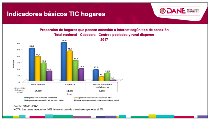 Según los datos arrojados por el Dane en el 2017, el 58,6% de los hogares ubicados en cabeceras municipales cuenta con acceso a internet. No obstante, si se mira la otra cara de la moneda, únicamente el 17% de los hogares ubicados en centros poblados y rurales cuentan con un acceso al servicio de internet.