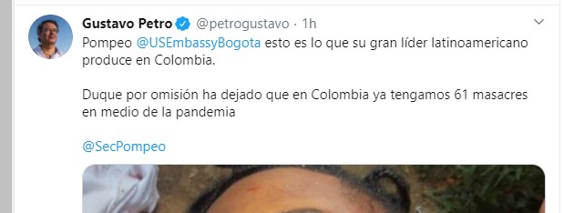 La imagen publicada acá no está completa, la de Petro es absolutamente explícita, mostrando el rostro de un muerto con crudeza lo que ha llevado a que la gente lo critique por hacer política con las masacres