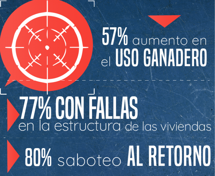 El informe consiste de tres partes: La primera, retorno & sabotaje. Opositores obstaculizan el retorno de las familias restituidas. Segunda, viviendas a punto de colapsar. La mayoría de las viviendas entregadas por el Banco Agrario, están en estado de riesgo estructural, requiriendo una interventoría independiente y técnica para investigar posibles actos de corrupción. El tercero, las afectaciones ambientales de la ganadería extensiva. Se presentan casos frente a la manera como el aumento en la ganadería afecta las tierras de las familias restituidas.