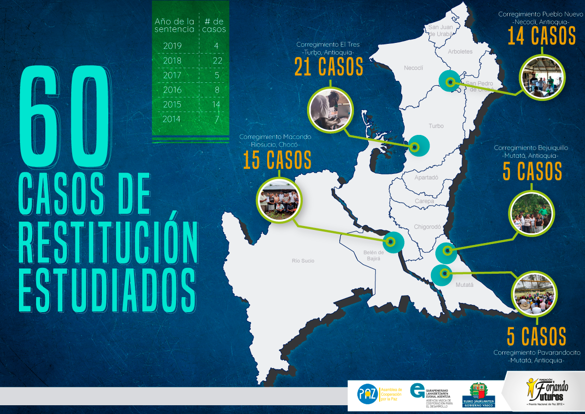 Hubo dos procedimientos diferentes. Uno es la Ley de Víctimas y Restitución de Tierras (1448 de 2011). En la totalidad de los casos de los corregimientos de Pavarandocito, Bejuquillo, El Tres, Pueblo Nuevo y en 8 casos estudiados de Macondo, la restitución se dio en el marco de la Ley 1448. El otro es el de la Ley Justicia y Paz (Ley 975 de 2005), siendo el marco de restitución de los 7 casos estudiados de la vereda Guacamayas del corregimiento Macondo (Turbo). En este último la Corte Constitucional en Sentencia SU 648 de 2017 determinó que se debían aplicar los mismos beneficios establecidos en la Ley 1448 de 2011.