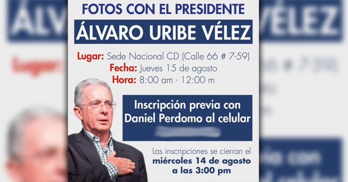 El próximo jueves 15 de agosto el expresidente Uribe estará en una sesión de fotos con los candidatos del Centro Democrático de todo el país a gobernaciones, alcaldías y concejos para impulsar sus campaña electorales. Y es que la imagen de Uribe, cabeza del partido, puede hacer despegar cualquier candidatura, como ya lo ha demostrado en elecciones anteriores. Por eso en la sede del partido estará desde las 7 de la mañana hasta mediodía tomándose fotos dispuesto ha darle un empujón a sus avalados de todo el país. Aunque la imagen no es clara en este punto, desde el propio partido nos confirmaron la información.