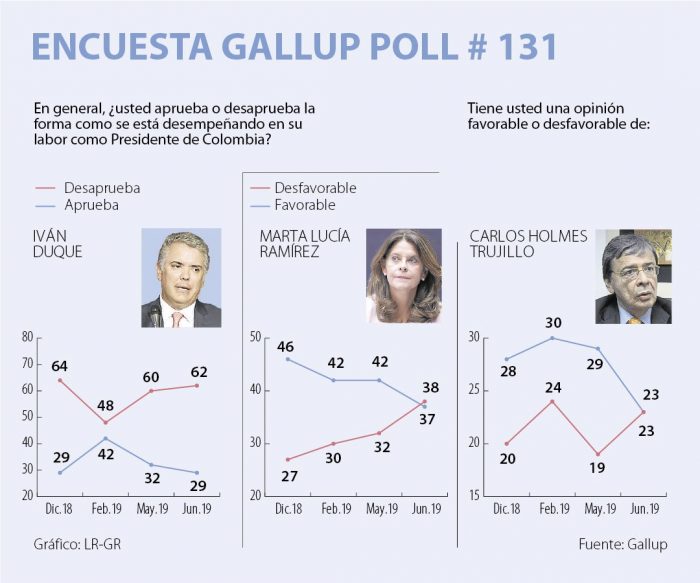 La reciente encuesta de Gallup correspondiente a junio de 2019 revela que la favorabilidad del presidente Iván Duque, la vicepresidenta Marta Lucía Ramírez y varios de los ministros del gabinete sigue cayendo en comparación con los resultados de mayo.