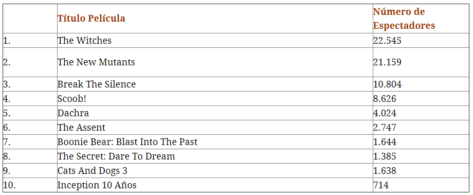 Las películas con las que se reabrieron los cinemas en el país fueron diez. La más vista fueron Brujas, protagonizada por Anne Hathaway, seguida en casi igual número de espectadores está The New Mutants. Este es el ranking completo del fin de semana pasado: