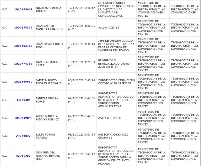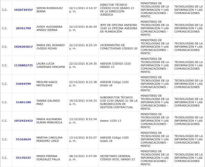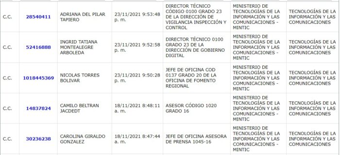 Por un lado, quien fuera la superintendente de transporte delegada, Adriana del Pilar Tapeiro, será la directora de vigilancia, control e inspección del Ministerio de Tecnologías. Dicho cargo en particular es un nuevo rol creado por la ministra Valderrama pues no se registran personas contratadas en dicha cartera con ese puesto y sería una de las movidas de la nueva ministra para blindar su gestión jurídicamente.