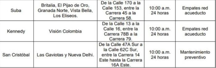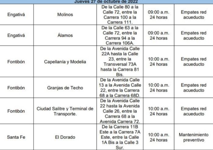 La empresa de acueducto y alcantarillado de Bogotá, este jueves 27 de octubre de 2022 adelantara el corte del servicio de agua en varias localidades de la capital; con el fin de realizar obras de mantenimiento y reparación de las redes de distribución para garantizar la prestación del servicio a los usuarios. De acuerdo con la entidad los cortes de agua en Bogotá buscan evitar daños en las tuberías, igualmente recomienda a la ciudadanía llenar tanques de almacenamiento y gastar el líquido en 24 horas, mientras que la empresa garantizara el suministro de agua en clínicas y hospitales con el servicio de carro tanque. Los barrios que se verán afectados con la suspensión del servicio son los siguientes: