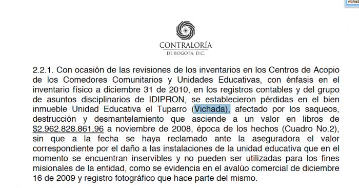 La Contraloría Distrital publicó en mayo del 2011 una auditoría que le hizo al Idipron y los hallazgos fueron alarmantes. En noviembre del 2008 (3 meses después de cerrar la Unidad Educativa el Tuparro) los saqueos a esas instalaciones sumaban $2.962.828.861,96 de pesos. Las instalaciones las vaciaron en menos de un semestre, y se robaron el equipamento que pertenecía al Idipron. Según Grajales, “lo que pudieron sacar lo sacaron”. Esto generó que solo el predio del Cejal (único perteneciente al Idipron) pasara de tener un valor de más de 4,000,000,000.00 de pesos (cuatro mil millones de pesos) en el 2007, a estar avaluado en 1,200,000,000.00 (mil doscientos millones de pesos) en diciembre del 2009. Se perdieron casi 3,000,000,000.00 (tres mil millones) de pesos solo en depreciación del terreno.