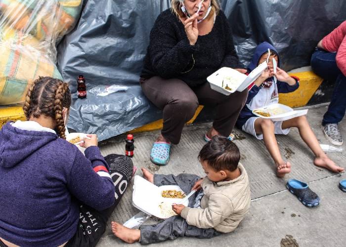 En una acera de cemento gris, una pareja de inmigrantes venezolanos carga un bebé de unos 8 meses. Los pocos paseantes cruzan la calle para evitar el contacto