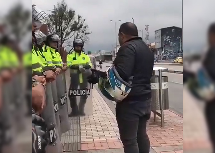 Un motociclista se bajó de su moto y empezó a rezar con los policías en la Av. Caracas en el centro de Bogotá