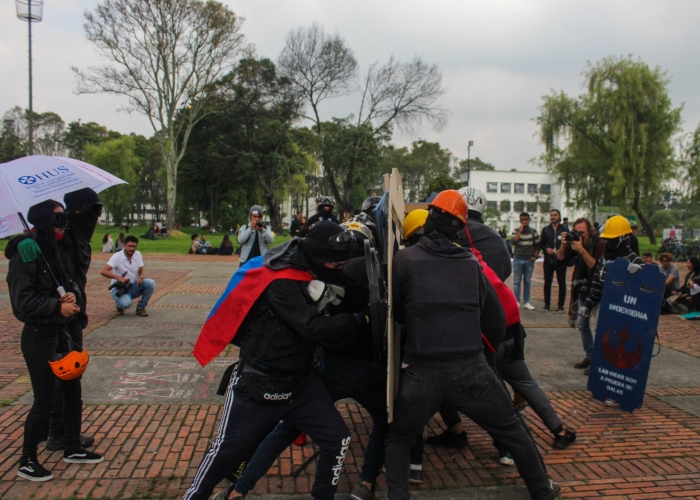 Llegaron madrugados a la U. Nacional para hacer ejercicios de contención, escape y avance para evitar ser golpeados y capturados por los hombres de negro