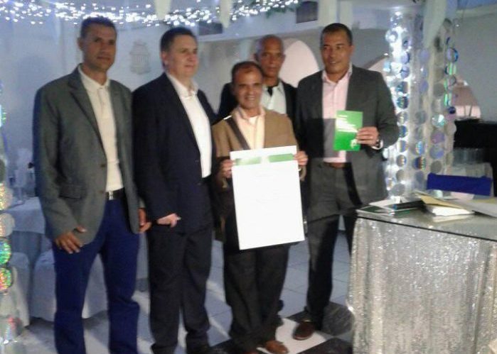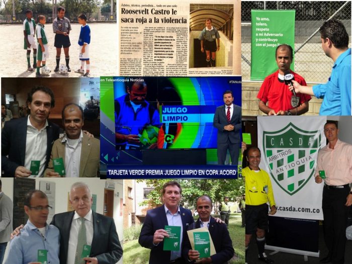 Adrián Vélez, exjuez de la Fifa, le entregó un reconocimiento a Roosevelt Castro por su contribución al juego limpio con su estrategia de la tarjeta verde