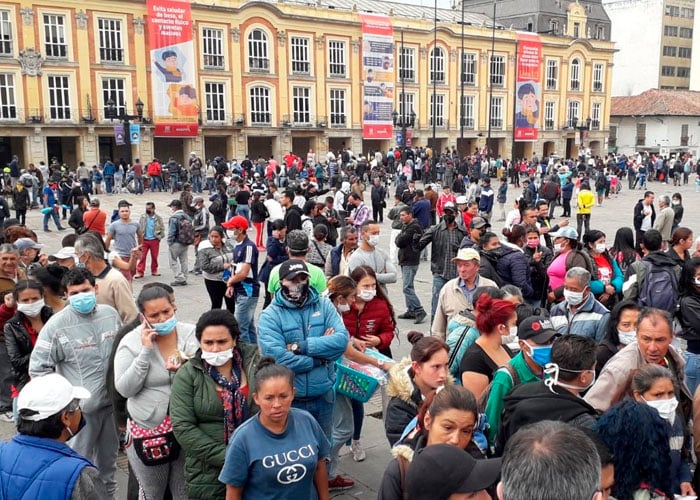 Cientos de venezolanos están concentrados en la Plaza de Bolívar, por un falsa cadena de Whatsapp que prometía ayudas económicas del gobierno para afrontar la cuarentena. Junto a ellos están además vendedores ambulantes, trabajadoras sexuales, recicladores, víctimas del conflicto y adultos mayores, quienes por el aislamiento obligatorio -que iniciará mañana en todo el país -se quedarán sin dinero para alimentarse o pagar una habitación.