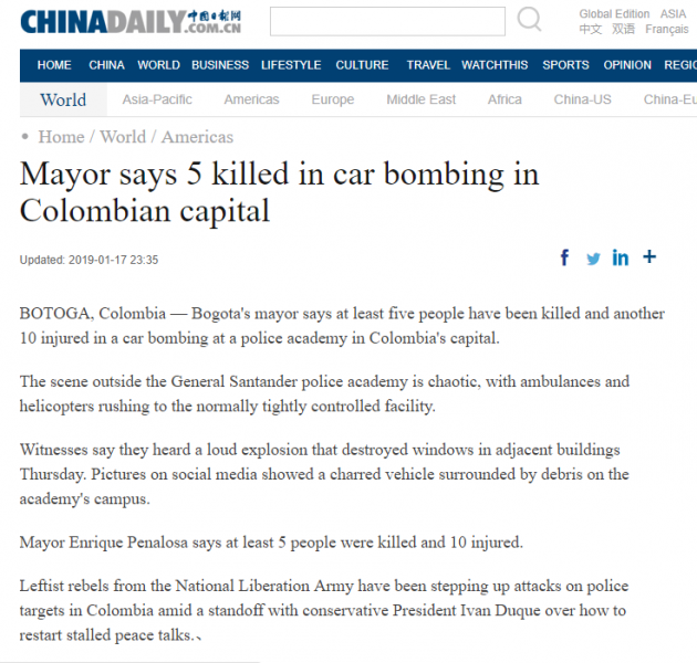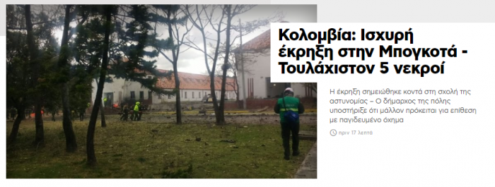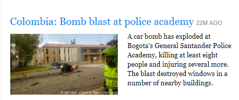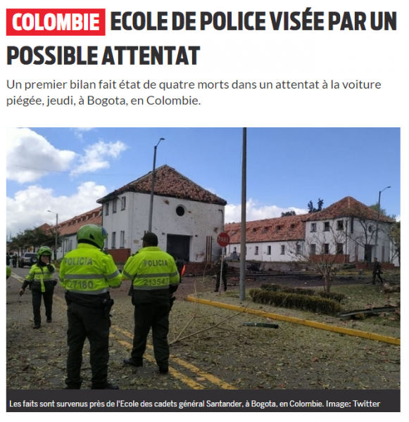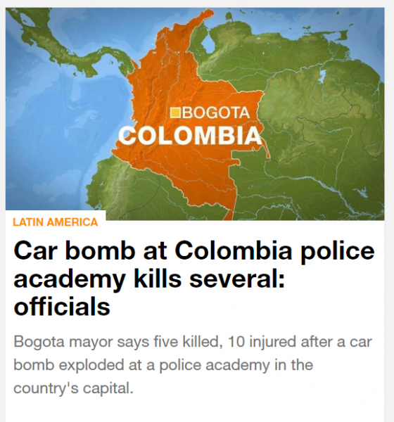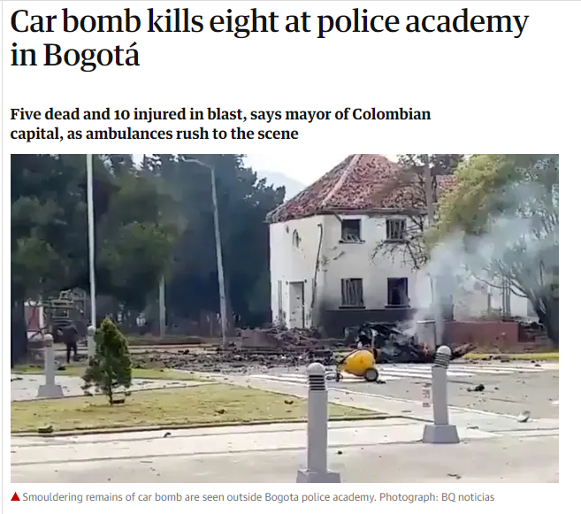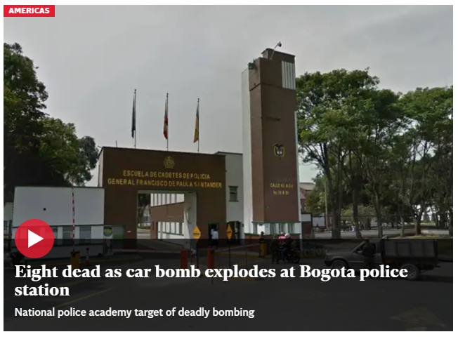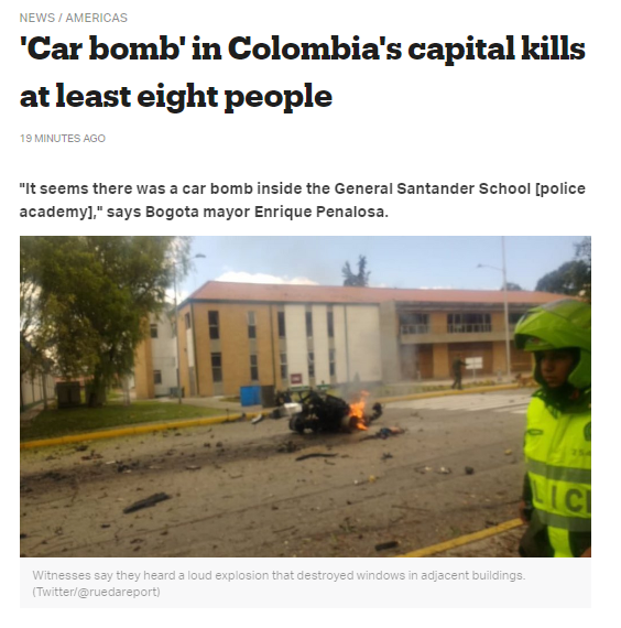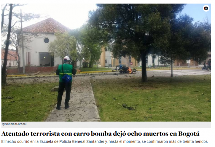Así registraron los medios el atentado con carro bomba a la Escuela de cadetes de la policía General Santander de Bogotá que hasta el momento ha dejado 8 muertos y más de 40 heridos. Se desconocen los móviles del atentado, así como los responsables de la camioneta que, cargada de explosivos, irrumpió en la edificación por el sector menos custodiado.
