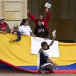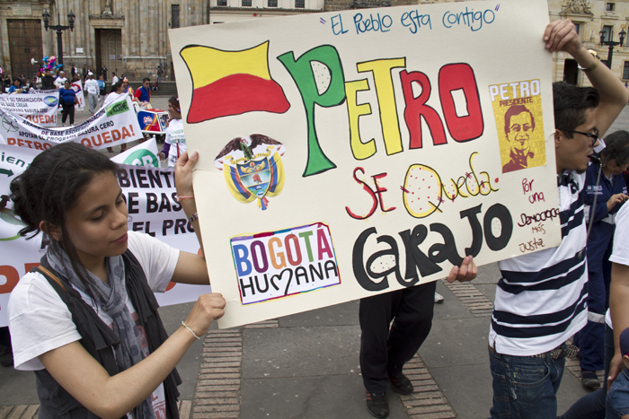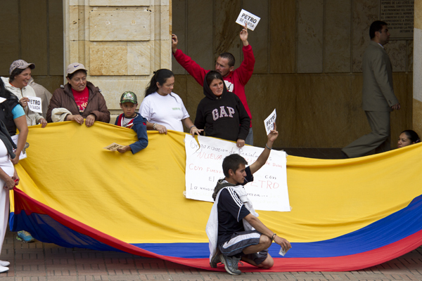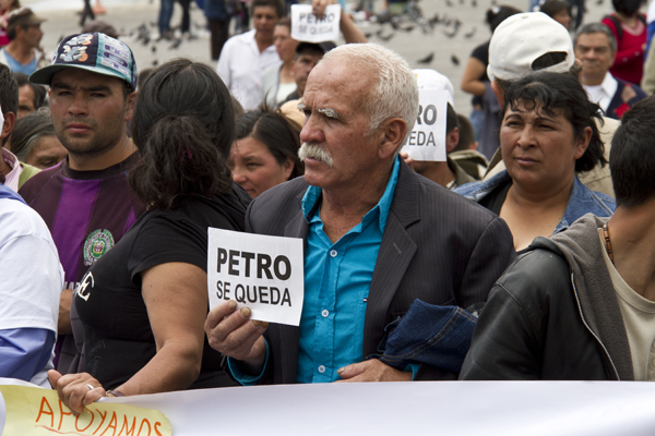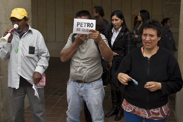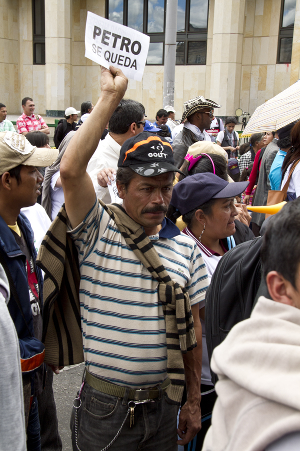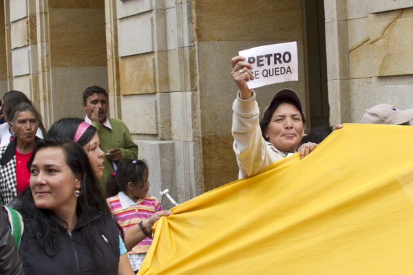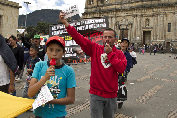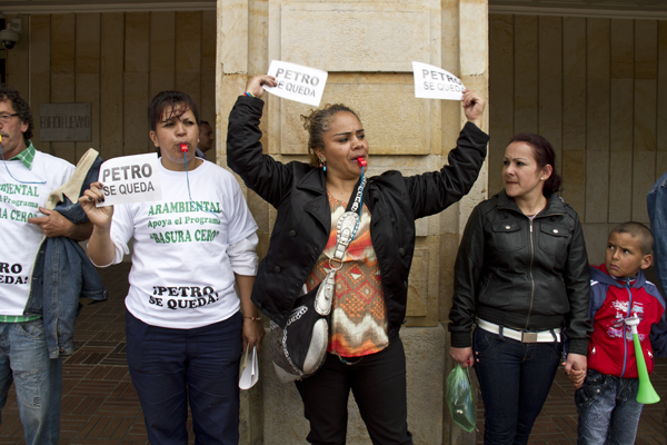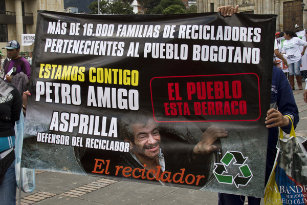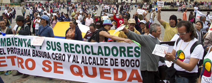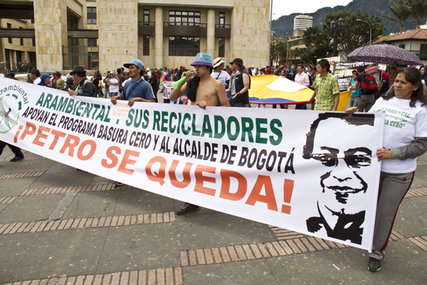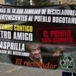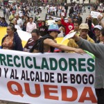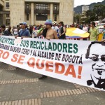 El mismo día que el referéndum revocatorio del alcalde de Bogotá entra en un limbo por decisión del tribunal de Cundinamarca, cientos de recicladores salen a la calle a apoyar al Alcalde con consignas “Petro se queda”. Los recicladores reconocen los beneficios para ellos del programa basura cero que ha sido una de las banderas de Gustavo Petro y que paradójicamente lo tiene contra las cuerdas en la Procuraduría que hoy formalizó la apertura de cargos. Ver fotos.
