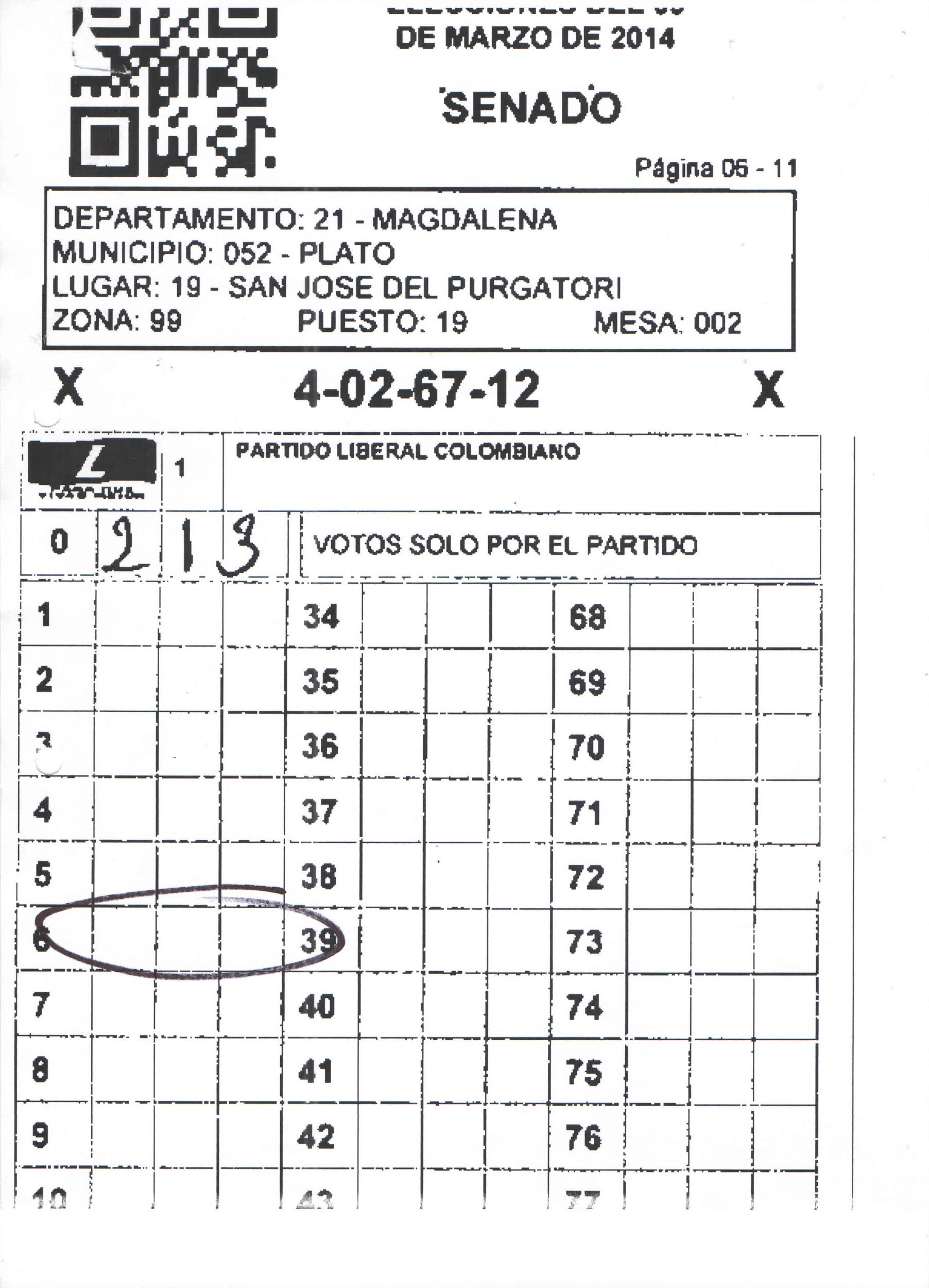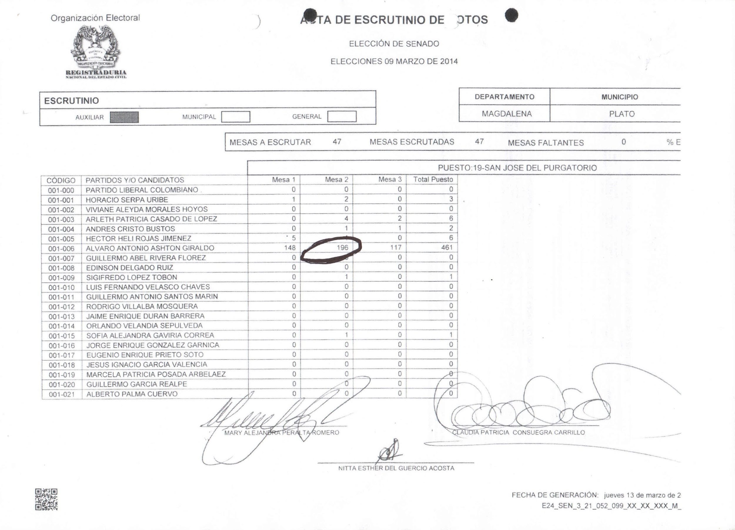 Para dar un ejemplo. En la mesa de votación 002, puesto 19 del municipio de Plato, Magdalena, al senador del Partido Liberal Álvaro Ashton, hoy detenido por su posible relación con el Cartel de la toga, no se le contó ningún voto en el formulario E-14; sin embargo, en el formulario E-24, avalado por la comisión escrutadora, le aparecen 196 votos. Además, en el acta general de escrutinio, documento final en el que se anotan inconsistencias o solicitudes de recuento de votos, no se registró nada anormal y avaló el resultado final de la mesa de votación.