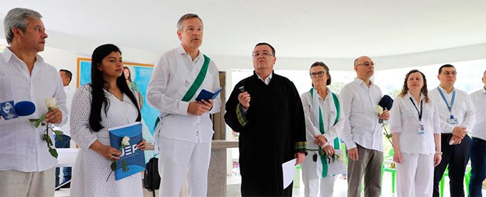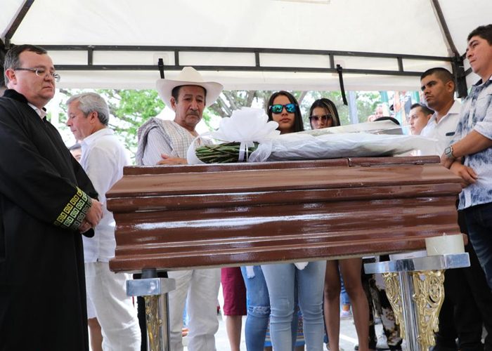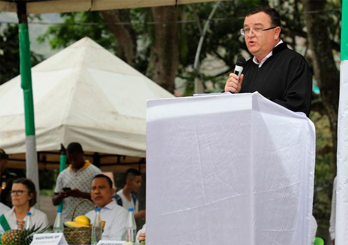 El magistrado Alejandro Ramelli junto al embajador de Francia en Colombia, Gautier Mignot, y la embajadora sueca en el país, Ewa Werner, entregaron el cuerpo de Edison Lexander. Fue después de una misa, acompañada por un desfile de niños del municipio, que los Lezcano Hurtado le dieron fin a su espera y lograron limpiar el nombre de su hijo, quien había llevado por 18 años la tacha de NN o guerrillero de las Farc. El entierro de Edison sirvió de pista para exhumar los cuerpos de otras tres personas al parecer registradas como falsos positivos en el mismo camposanto.