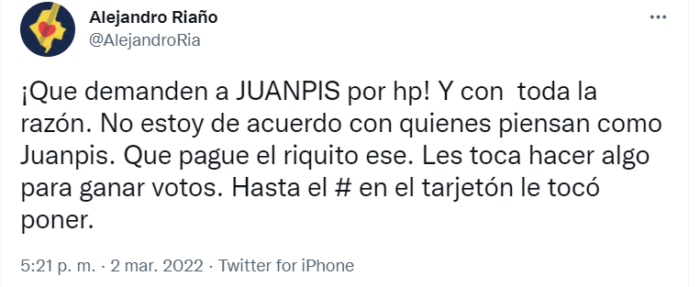 A mi me molesta la hipocresía de Riaño. No me importa si su esposa, Maria Alejandra Manotas, necesite 2 empleadas diarias para controlar su casa, que haya estado en contra de la decisión de la Corte sobre la despenalización del aborto, cada quien puede hacer con su plata lo que quiera, lo que necesite. El problema es cuando se quiere pasar por algo que no se es, del furibundo opositor del capitalismo cuando se anda censurando a la prensa o usar su maldito personaje para tratar de negrito, pobre y gay a un muchacho que no comulga con su comunismo fresita.