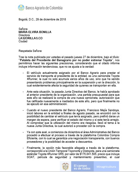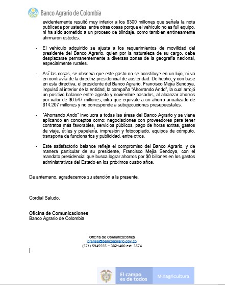 En diciembre de este año el Banco Agrario procedió a adquirir una camioneta Toyota 4Runner para uso del presidente Francisco Mejía, quien asumió el cargo el pasado agosto. Las2orillas informó del hecho y la oficina de comunicaciones envió una carta con las siguientes precisiones.