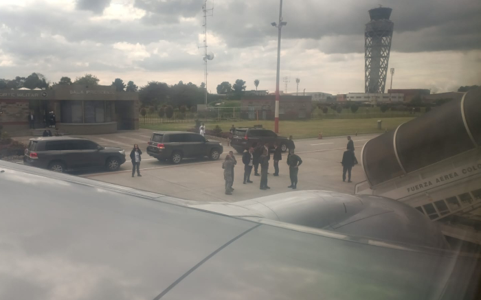 El presidente Gustavo Petro llega a la pista aérea militra de Catam con su potente esquema de seguridad, donde lo espera la comitiva que viaja a su lado. Foto: Las2Orillas
