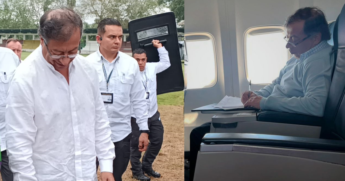 En tierra se queda la mayor parte de los escoltas de Petro. Al avión solo se suben 16 hombres bien armados de los casi 40 que cuidan su vida en Bogotá y que andan de arriba abajo en nueve camionetas Toyota, casi gemelas. Su seguridad es un tema primordial para él. Petro siempre ha pensado que lo quieren asesinar. El exgeneral William Salamanca, muy cercano al presidente, dice que Gustavo Petro, después de Joe Biden, es el hombre más amenazado del planeta.