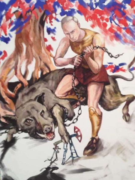Por motivo del cumpleaños 62 del mandatario ruso, una organización denominada Grupo de Admiradores de Vladimir Putin organizó una singular exposición la cual consta de doce cuadros en los cuales se utiliza la imagen del presidente para reemplazar a Hércules, reconocido héroe de la mitología griega e hijo del máximo dios Zeus, caracterizado por su extraordinaria fuerza, coraje y demás virtudes. El regalo será entregado al líder y el nombre concreto de los artistas que lo hicieron se desconoce hasta el momento. Las imágenes hablan por sí solas: