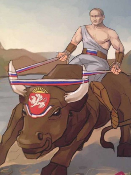Aquí vemos al mandatario luchando contra una hidra cuyas cabezas son Estados Unidos, Canadá y Japón, países que sancionaron a Rusia por su actuación en Ucrania.